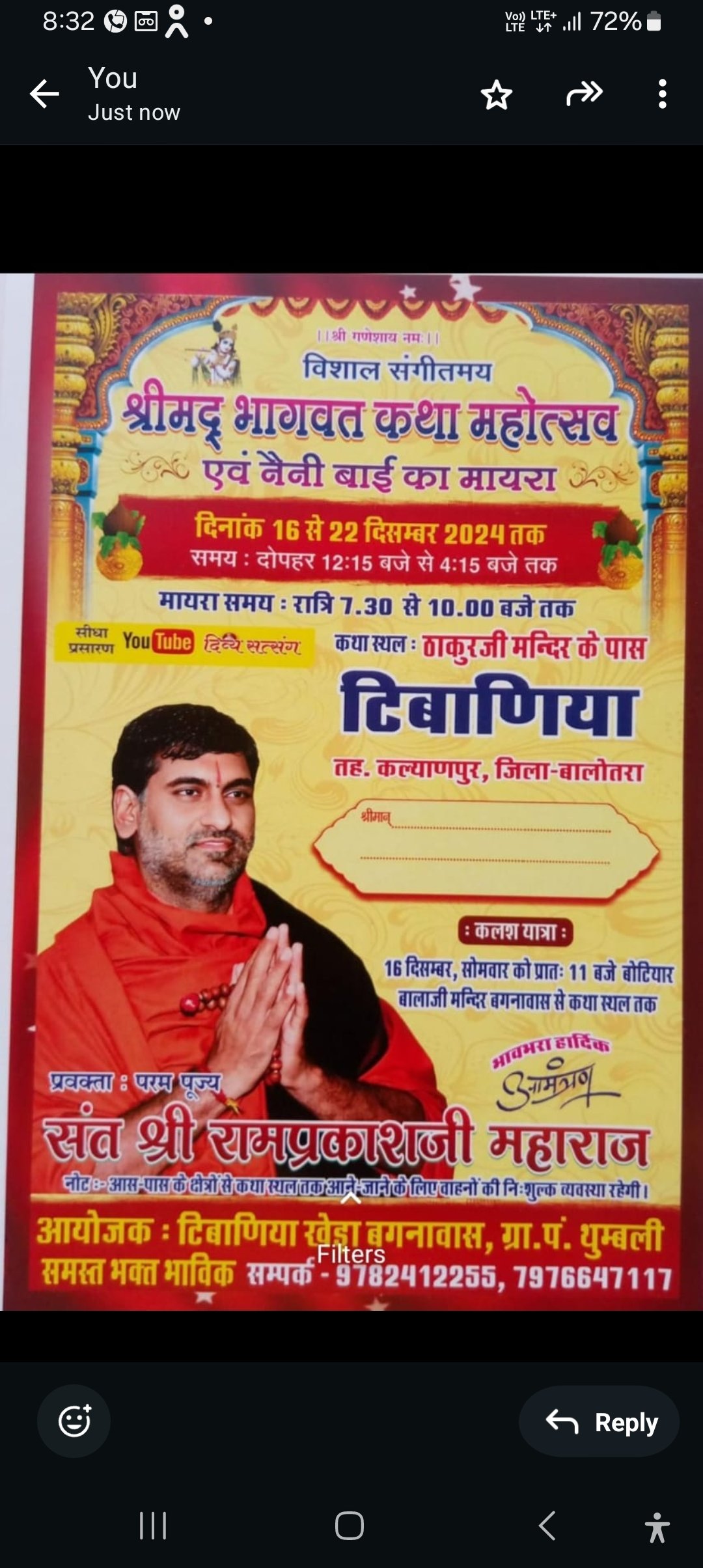 टिबानिया में में 16 से 22 दिसंबर तक श्रीमद भगवत कथा एवं नानी बाई का मायरा का आयोजन