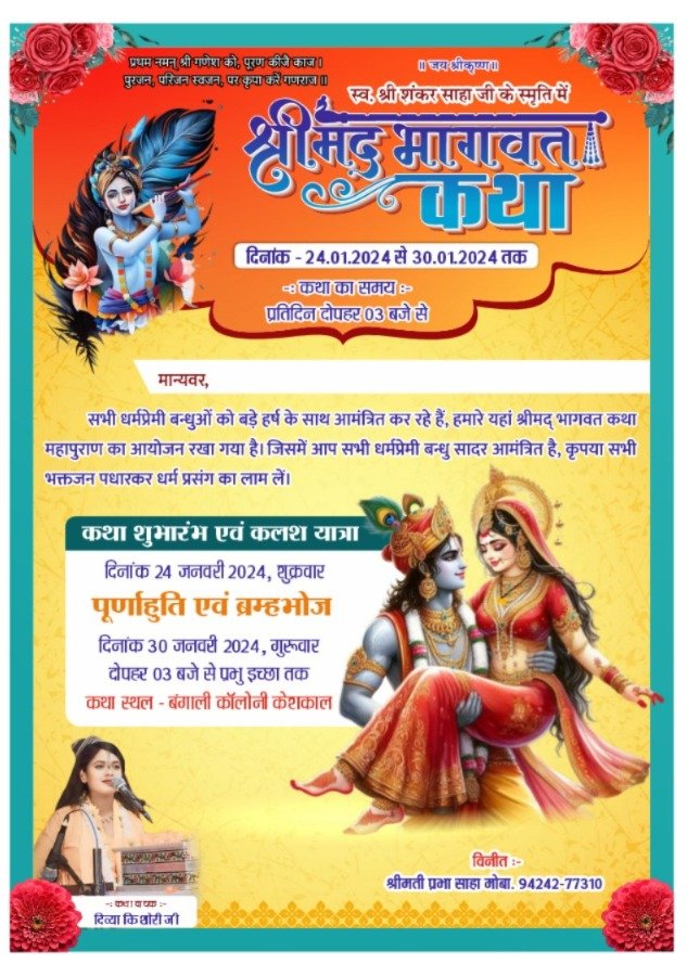 श्रीमती प्रभा साहा समस्त धार्मिक जनों से अधिक से अधिक संख्या मे कथा स्थल मे पधारकर श्रीमद भागवत कथा श्रवण करने की विनम्र निवेदन किया है