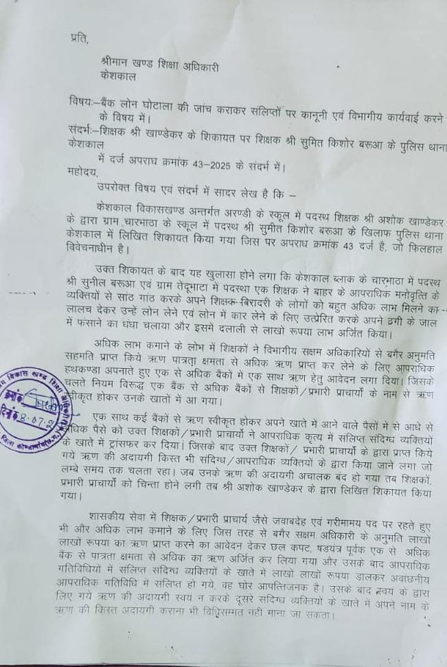 केसकाल क्षेत्र में शिक्षकों को बैंक द्वारा ऋण जारी करने के मामले में समाजसेवी और वरिष्ठ पत्रकार कृष्ण दत्त उपाध्याय ने बड़ा घोटाला होने का आरोप लगाया है। उन्होंने खंड शिक्षा अधिकारी को लिखित पत्र देकर जांच की मांग की है।
