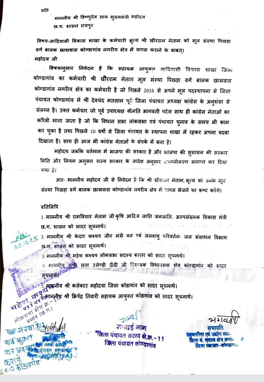 कोंडागांव जिला पंचायत में एक चौंकाने वाला मामला सामने आया है, जहां एक चतुर्थ श्रेणी कर्मचारी, खीरराम नेताम, पिछले 10 वर्षों से जिला पंचायत की स्थापना शाखा में कुंडली मारकर बैठे हैं। उनकी मूल नियुक्ति ‘पिछड़ा वर्ग बालक छात्रावास’ में है, लेकिन वे जिला पंचायत में अघोषित सत्ता चलाते हैं। बस्तर सांसद महेश कश्यप ने उन्हें उनकी मूल संस्था भेजने के निर्देश दिए थे, लेकिन रसूखदार नेताओं के फोन के कारण आदेश जारी नहीं हो पा रहा है [1]।
